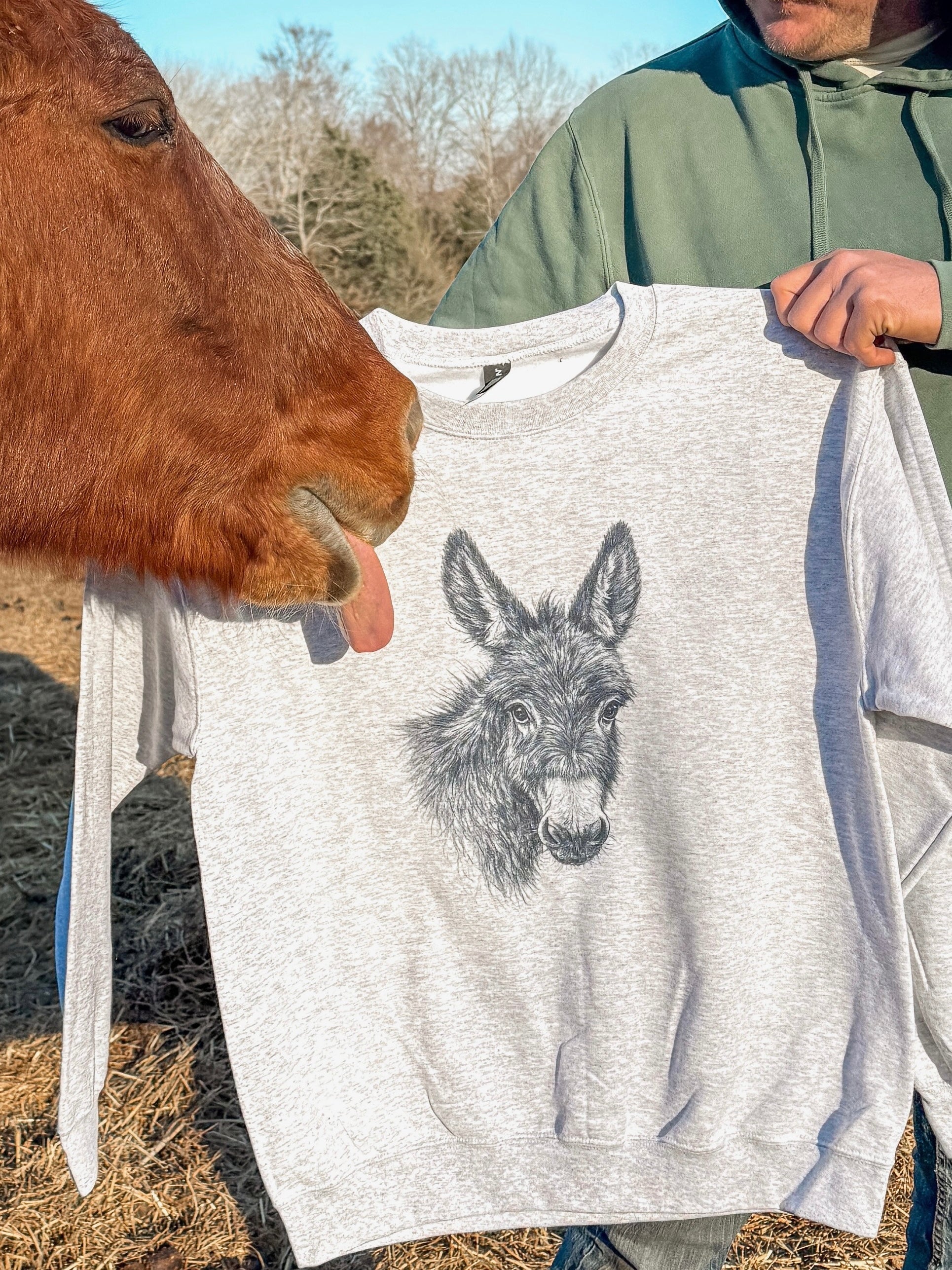 Cash isn’t just a donkey — he’s a symbol of hope, resilience, and the incredible things that happen when love shows up at the right moment. This Cash Sweatshirt was created to honor his story and help continue the work he inspires every single day.
